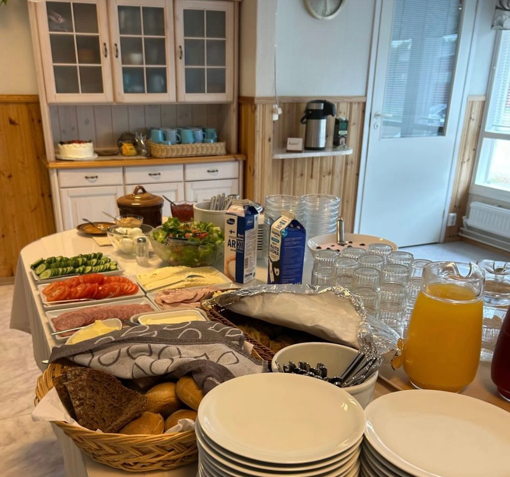 Päätalon ruokailutilassa on seuraavana aamuna aamiainen klo 9.30 – 11 katettuna seisovaan pöytään.